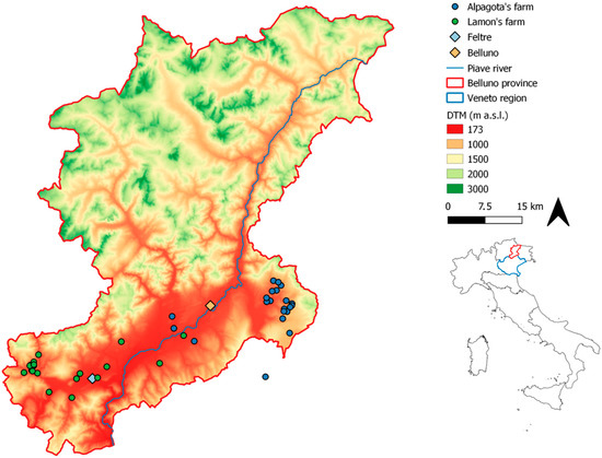 Alpagota and Lamon are local breeds typical of Alpago and Lamon-Feltrino areas, both located in the south of Belluno province [55]. All the farms considered in this study demonstrated a strong link with the territory, maintaining a mosaic landscape and providing high quality products.