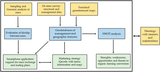 The data collection, analysis or treatment, and the relative contribution of the information obtained to the achievement of the project’s aims are shown in Figure 3. Data were collected by surveys between August 2019 and January 2020, and involved 35 farms which were representative of the study area production’s context. Genomic mapping of rams was performed and the results used to assess a matrix of relationships between rams, which allowed the development of a smartphone application supporting the farmers in the choice of rams exchanged and the consequent mating plans. Farm surveys and the collection of cadastral and land cover maps were used to build a geodatabase of farm management and geographical features. The genetic information, as well as the information regarding farm management and geographical features, was integrated into the development of the smartphone application. Indeed, a description of each farm was used in QR code-based labelling of the products. Finally, the outputs of meeting with farmers and stakeholders (tourism operators, restaurateurs, representatives of the local association, local policy makers) were used in conducting a SWOT analysis to obtain a better insight into the feasibility of organic farming conversion of Alpagota farmers. This task was developed only for the Alpagota breed since the population size justified the interest towards organic farming and the relative costs with respect to the Lamon breed. This breed is characterized by a smaller population size and couldn’t address the certification and traceability fees.