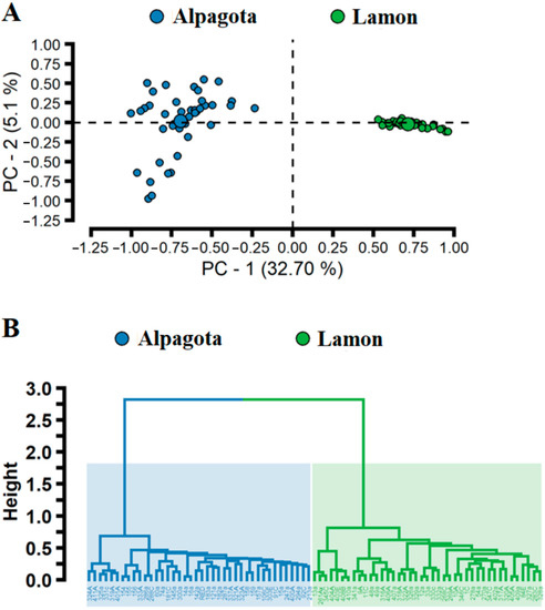 Alpagota and Lamon population structure based on genomic information. Above, (A) Principal Coordinate Analysis based on the genomic kinship coefficient. Below, (B) hierarchical cluster based on Ward’s hierarchical method from genomic matrix, for Alpagota (n = 40) and Lamon (n = 41).
