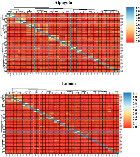 Principal Component (PC) analysis identified genetic stratification among Alpagota and Lamon breeds and the two PC explained 37.8% of the genetic variation across the breeds (Figure 4A,B). As expected, differences between Alpagota and Lamon were large, although Lamon exhibited more genetic similarity, whereas Alpagota showed more dissimilarity, indicating more variability within this population compared with Lamon. These results reflect directly on the relationship between animals in the population as observed by plotting the G matrix by the difference in the subgroups within the population, in which it is observed that Lamon had the highest proportion of closed related animals in comparison with the results observed in the Alpagota breed (Figure 5). Alpagota showed 10 subpopulations that are more related to each other; in Lamon, 8 groups were observed that are more related to each other (Figure 5).