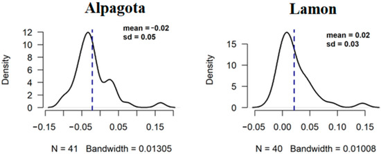 Table 2 reports the descriptive statistics and farmer features. Data were collected in 17 farms with the Alpagota and 18 with the Lamon breed, managed by farmers of average age 47 ± 15 year, with a workforce of 1.8 ± 1.3 units, and little difference between the farms of the two breeds. The differences between the two breeds were tested with a one-way non-parametric ANOVA (Kruskal–Wallis test). In most cases, the farmers had other employment (72% for Lamon and 82% for Alpagota), and livestock farming was conducted part-time. Moving to flock sheep characteristics and management, the total number of heads surveyed was 1989 (337 of Lamon and 1652 of Alpagota breed, respectively). The Alpagota flocks were characterized by a small flock size (14.6 ± 18.6 LU/farm), and those of the Lamon breed by a very small flock size (2.8 ± 1.9 LU/farm), although the total LU/farm did not differ since other animals of different breeds and/or species, such as cattle and horses, were considered. The average amount of forage administered was 1.81 ± 0.5 kg DM/head/day, 88% of which was on-farm, indicating a high level of self-sufficiency. The average amount of concentrate administered per day was low and, in general, was produced off-farm. No statistically significant differences were found between Alpagota and Lamon breeds, except for the variable LU, according to the population size previously reported (DAD-IS, www.fao.org/dad-is/en, accessed on 18 September 2021). Lambings were mostly concentrated in winter, spring and autumn.