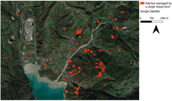 The georeferenced data were implemented in QGIS software to highlight the patches managed by these livestock systems. Figure 7 shows an example of the patches managed by a single farm, located in the Alpago region. Moving from the lake to highland pastures, following an altitudinal gradient, the patches with a red color were identified. As can be seen from the map, a single farm was able to manage a large number of small patches of grassland in the most marginal areas, with several ES linked to this traditional livestock system activity. The patches are characterized by important slopes and reduced accessibility, which only small ruminants were able to graze.