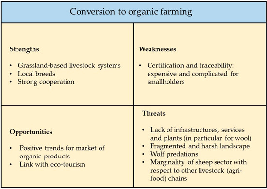 One of the aims defined with the project partners was to explore the potential added value generated by the certification for organic labelling. Based on organic farming systems regulations and on the information collected during the survey, a SWOT analysis was carried out to evaluate the potential for conversion to organic farming for Alpagota breed farmers. We focused on the Alpagota sheep breed because the farmers showed interest in applying for this certification, whereas for Lamon this opportunity needs to be further explored. Data on farm management were collected during the on-farm survey. The data were used to collect information on potential difficulties in the transition towards organic labelling for each single farm. The SWOT analysis allowed for identification and evaluation of internal factors (strengths and weaknesses) and external ones (opportunities and threats) in order to evaluate the opportunity of conversion to organic production systems.