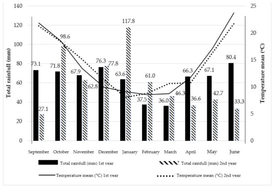 The region of investigation has a temperate climate, with hot and humid summers followed by warm and rainy winters. During the first year, the mean humidity ranged from 56.3 to 81.5%, while as in the second year, it ranged from 66.5 to 80.8%. The first year’s rainfall distribution was more regular than the second year’s, and more precipitation and temperature were reported in April and May, which are considered the plant’s rapid growth stage. In the second year, mean precipitation and temperature were lower than the first year, especially in April and May (Figure 1).