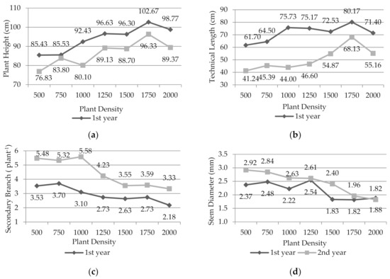 Among plant densities, the lowest stem diameter (1.89 cm and 1.85 cm) were obtained at 1750 plant m−2 and 2000 plant m−2 densities, respectively (Table 2). The second year’s stem diameter (2.45 cm), which was more arid, and showed higher than the first year’s (2.16 cm) (Table 3). The drop in plant density resulted with the increase in stem diameter after 1250 plant m−2 in both years (Figure 2d).