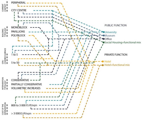 Figure 4 represents a first attempt to support DMs in taking a decision about the adaptive reuse of healthcare facilities or at least to show the outcomes of existing case studies. On the left side of the graph, the criteria analyzed for each building are presented with the different options, while on the right side the new functions identified are listed. According to the location, the typology, the ratio between GFA and covered surface area, the intervention typology, and the possible cost, several suitable alternatives of adaptive reuse could be selected.