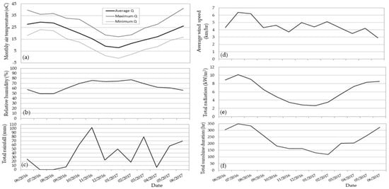 Average, maximum and minimum monthly air temperature (a), average monthly relative humidity (b), total monthly rainfall (c), average monthly wind speed (d), total monthly radiation (e) and total monthly sunshine duration (f), during the experimental period from June 2016 to June 2017.