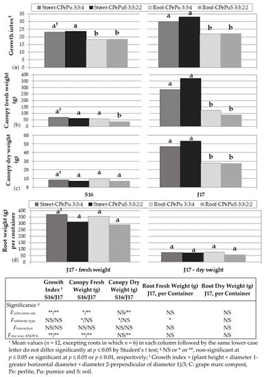 Effect of cultivation site and substrate type on growth index (a), canopy fresh (b) and dry (c) weight, and root weight per container (d) of C. maritimum, after cultivation for two and twelve months in plastic containers with a green-roof infrastructure fitted (September 2016, S16 and June 2017, J17).