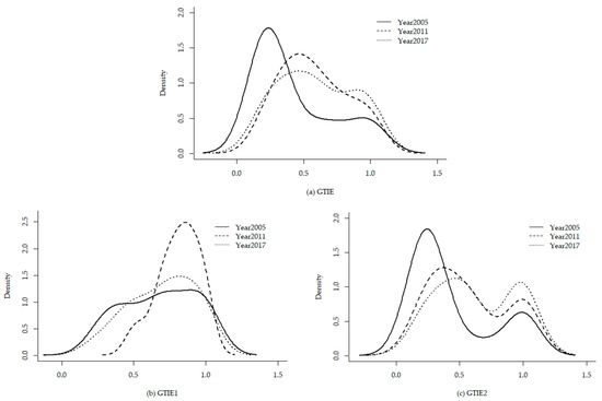 The kernel density diagram is used to observe the dynamic evolution of industrial GTIEs. The graphical presentations include the overall and stage-wise industrial GTIEs in 2005, 2011 and 2017 (Figure 2).