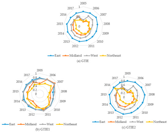 All in all, although overall GTIEs were low in China between 2005 and 2017, it is on the track of steady development. Also, gradient changes can be observed for provinces and regional difference become increasingly prominent.