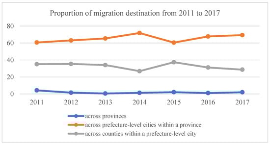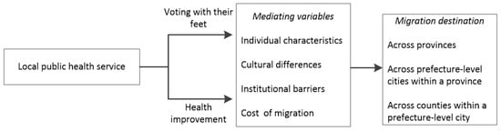 Local public health services affect migration destinations through two channels according to the literature. First, if people are not satisfied with the public health services of their residence county, they can choose to migrate to other places [31,32,33,34], which is “voting with their feet”. Some studies have defined moving out of county as migration [35,36]. There are three destinations for the migrants moving out of county, including across counties within a prefecture-level, across prefecture-level cities within a province, and across provinces. Considering that counties within a prefecture-level city face the similar financial constraints comparing with the countries of other prefecture-level cities, it means that they are more likely to have similar public health services.