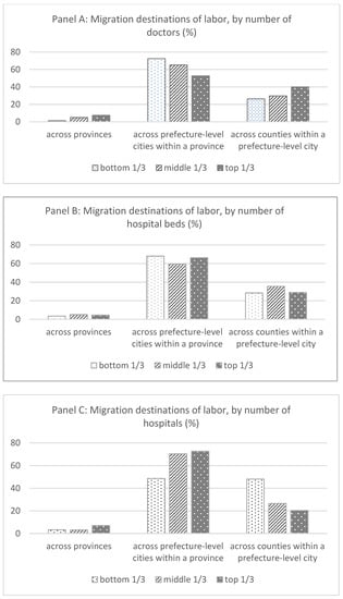 The relationship between the number of hospitals and migration destinations varied according to the increase of the number of hospitals. Of the laborers in the counties with bottom 1/3 of the number of hospitals, 3.27 percent migrated across provinces, which was much less than those from the counties with top 1/3. The laborers from the counties with top 1/3 of the number of hospitals were more likely to migrate across prefecture-level cities within a province, whereas those from the counties with bottom 1/3 of the number of hospitals were more likely to migrate across counties within a city (Figure 3, Panel C).