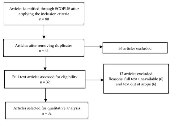 The conducting stage requires the collection and analysis of the relevant studies extracted from the databases according to a predefined inclusion criterion. From this perspective, the inclusion criteria for this review comprise the journal articles in the English language. The start date of the review was not specified to obtain the maximum number of articles [34]. Different keywords (Table 1) were used to explore the relevant articles from the popular database SCOPUS. It is recognized as a reliable database and is suggested by various researchers [35,36,37,38]. The keywords were searched in the title, abstract, and keywords list. As a result, 80 articles were identified in the first stage after applying the inclusion criteria where the first article was published in 1994. After removing the duplicates, 44 articles were selected. Additionally, six articles were excluded due to the unavailability of the full text. After evaluating the content of the articles, a further six articles were excluded. Finally, 32 articles were selected that were relevant to the study requirements. Figure 1 presents the filtering procedure of the articles using the methodology for reporting systematic reviews PRISMA (preferred reporting items for systematic reviews and meta-analysis).