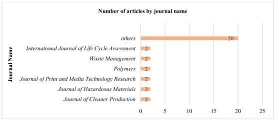 Figure 2 exhibits the number of articles published in peer-reviewed journals. The chart highlights that the Journal of Cleaner Production, Journal of Hazardous Materials, International Journal of Life Cycle Assessment, Polymers, Journal of Print and Media Technology, and Waste Management contributed two articles each (37.50%). The “Others” category in the chart indicates the journals with a single publication, which is 62.50% of the total published articles.