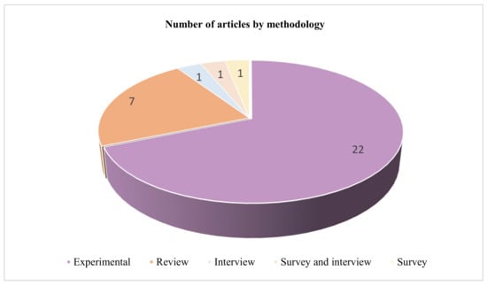 Figure 3 presents the articles distribution according to the research methodology adopted in the selected studies, which included the experimental research, case study, review, survey, and interview. The analysis reveals that the experimental research is primarily used as a research methodology in 22 articles followed by the literature review methodology used in 7 articles. Further, case studies, interviews, and surveys were used in only a few studies e.g., [10,40].