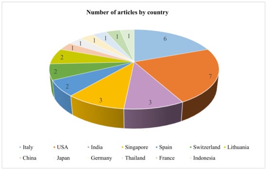 Figure 5 presents the distribution of the articles by country classification. The SLR results indicate that most of the research is undertaken in developed countries with 22 articles (68.80%). Further, within the developed countries, 14 articles (63.60%) are published from the European countries, which shows the increasing environmental awareness in these countries. Among the European countries, most research is conducted in Italy with six publications, followed by Spain, Switzerland, and Lithuania with two articles each. On the other hand, only 10 articles are published from developing countries.