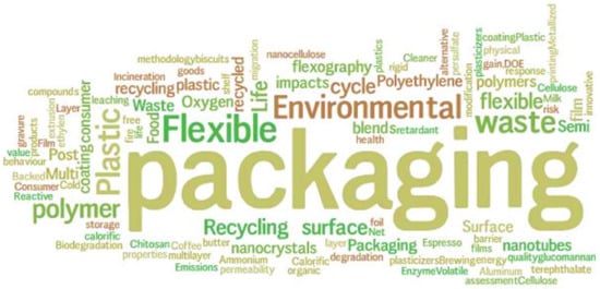 In addition, Figure 6 presents the word cloud for highlighting keywords used in the 32 articles, which show the most frequently used words such as “flexible packaging”, “plastic”, “waste”, “recycling”, and “environmental” whereas keywords including “volatile organic compounds”, “health”, and “emissions”, are less frequently used. The keywords analysis highlights plastic waste (solid waste) as a major concern in prior studies as compared to other environmental sustainability issues such as VOCs emissions, soil pollution, and health and safety risks.