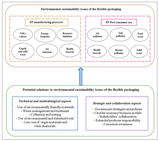 FP is effectively fulfilling the consumer requirements of product safety and long shelf-life. Nevertheless, the environmental sustainability aspects must be considered along with the economic performance to achieve lower costs in production and ease of transportation due to lightweight and low volume [13,18,19]. While several recent studies have investigated emerging environmental sustainability issues concerning FP and have emphasized mitigation strategies for overcoming environmental challenges [20,21,22], the academic scholarship and managerial practice remain fragmented and isolated in this particular research domain. For example, Ahamed et al. [3] examined environmental sustainability issues of the mismanaged post-consumer FP waste such as marine pollution, air pollution, and soil infertility, and demonstrated different waste management techniques including incineration, landfill, and recycling. Kliopova-Galickaja and Kliaugaite [1] investigated the environmental sustainability issues including volatile organic compounds (VOCs) (e.g., ethanol, ethyl acetate, and isopropyl alcohol) emissions, energy use (e.g., electrical and thermal energy), and greenhouse gas (GHG) emissions (e.g., carbon monoxide (CO) and nitrogen oxides (NOx)) linked with the manufacturing processes of FP. However, there is a dearth of research that has examined the greening of FP holistically and explored the environmental impact of this segment of the packaging industry. To the best of our knowledge, there is no other such research work available that investigates the environmental burden of FP. There is a dearth of literature that examines potential solutions to address these issues through a comprehensive literature review and develop holistic insights on environmental sustainability aspects of this industry. To bridge this knowledge gap, the primary objective of this review article is to identify, synthesize, and critically examine the key environmental issues associated with FP and propose potential solutions for reducing environmental problems. Therefore, this paper addresses the following research question (RQ).