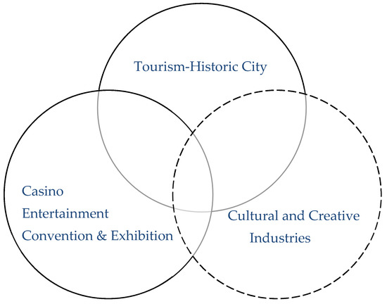 To discuss Macao’s situation, we can borrow the three-circle hypothetical interactive consumption model proposed by Richard Prentice in urban marketing research, which he explored using the Edinburgh Fringe Festival as a case study [78]. Prentice put into this hypothetical interaction the three categories of “tourist historic cities”, “Scottish performing arts in a Scottish context”, and” international performing arts”, which described the three types of tourists who spend most of their money in Scotland. In the hypothetical interaction model, the circles are not fixed but move inward or outward depending on whether the consumption patterns of tourists overlap. If the three circles are close to each other until they almost overlap, this means that the consumption blocks of tourists are highly overlapped. In other words, when a tourist comes to Scotland, he or she will not only visit the ancient cities of Scotland, but also enjoy the Edinburgh Fringe Festival. Visitors to Edinburgh’s world-famous Fringe festival will also see the sights of Edinburgh. In Figure 2, picture A shows that a highly overlapping interaction is ideal, which shows that while there is a primary purpose for a trip, visitors do not spend exclusively on one type of consumption, but on a variety of things within the city that benefit many industrial sectors at the same time. Contrary to this ideal situation, picture B assumes that the three circles in the interaction are dispersed outwards with minimal or no intersection. Such interaction is not ideal because the consumption blocks of tourists do not overlap, which means they do not visit other places for consumption other than their intended purpose. Such a situation also means that the industries in these blocks cannot promote each other’s growth, and in the process of publicity, due to their different consumer groups, they must pay more costs, making it also difficult to develop new customer markets.