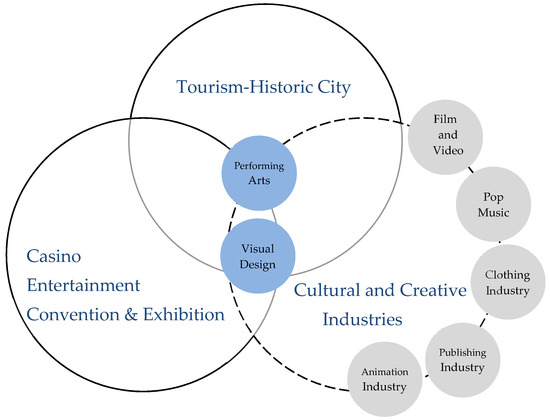 The performing arts industry and the design and visual arts industries belong to the “audience-to-content” CCIs, which are suitable for the development of tourist cities such as Macao. In addition, such CCIs have tight associability with the existing advantageous industries in Macao: the cultural tourism industry, the exhibition industry, and the gambling industry, which are audience-driven industries. Moreover, the talents cultivated by such industries, such as those in the fields of design and performing arts, can also be applied to a wider range of industrial and commercial companies. Therefore, these kinds of CCIs are more likely to be developed in the future. In this way, such CCIs should be the focus of the development categories in Macao in the future.