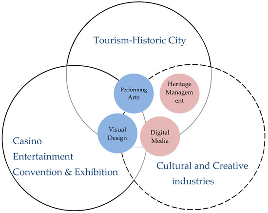 The gambling industry in Macao is now gradually developing toward a broad gambling entertainment industry. In addition, the performing arts are also an important industry for the entertainment development of the gambling industry, and the staff cultivated by the performing arts can also be engaged in other relevant CCIs. Digital media, design, and visual arts are basic demands for the high-quality development of all industrial and commercial companies, and the gambling industry is no exception in terms of talent and industries in these areas. Design and visual arts provide beautifying functions, which supply services relating to interior and advertising design for the gambling industry. In addition, the digital media industry can improve the efficiency of commercial operations in the gambling industry. For example, the digital media industry can improve online booking and social media marketing systems for the gambling and tourism industries. The gambling industry can also expand its online business through the digital media industry. Moreover, although posited as a resistant force against ‘casino capitalism,’ some heritage projects are supported by revenue from the gambling industry, which also invests in other public amenities to fulfill the requirements of the Macao government [114,121].