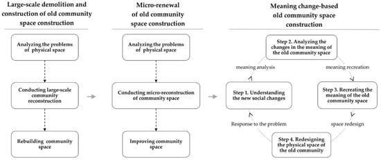 The previous review of the transformation of spaces in the old communities revealed that both major demolitions and micro-renovations have failed to address the continued deterioration of space of the old community fundamentally, which is detrimental to the sustainable development of cities. The problem of continuous deterioration of space has not been solved because the above transformations have not fundamentally contributed to a change in the meaning and value of the community. Although the concept of meaning change was developed in product and service design, this logic of rethinking design issues based on social change to propose new solutions can provide an excellent solution to the problem of spatial deterioration in old communities during urban development. When redesigning the old urban space, if we rethink the economy, culture, and people’s living conditions of the new society, it is possible to discover new problems that arise in urban regeneration and reinvent the meaning of old urban spaces through the analysis of the problems. Eventually, we can redesign the community based on the new meaning to solve the environmental problems of the old community space and achieve the sustainable development of the old community (Figure 1).
