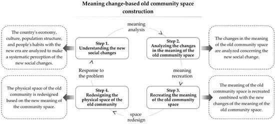 Building a conceptual framework through the concept of meaning change is helpful to guide the design process and make the design have new significance [32]. Combined with the theory of meaning change, this paper develops a conceptual framework for redesigning the spaces in the old communities, divided into four steps. First, the country’s economy, culture, population structure, and people’s habits concerning the new era are analyzed to create a systematic perception of the new social changes. Second, the changes in the meaning of the old community space are analyzed with the new social change. Third, the meaning of the old community space is recreated combined with the new changes of meaning of the old community space. Finally, the physical space of the old community is redesigned based on the new meaning of the community space. This conceptual framework based on meaning change can guide the transformation of the space of the old community and the transformation of all kinds of old spaces in the city (Figure 2).