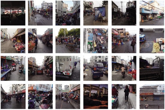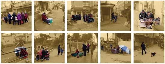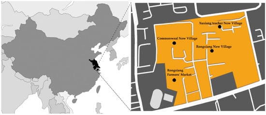 The case study is based on space in an old community in Rongxiang, Wuxi (in southeastern China’s Jiangsu Province), located near the Rongxiang Farmers’ Market on Liangxi Road, Binhu District, Wuxi. The Rongxiang block comprises the old community built in the 1980s and the mall building built at the beginning of 2000, including the Commonweal New Village, Rongxiang New Village, Xuxiang teacher New Village, Rongxiang Farmers’ Market (Figure 3).