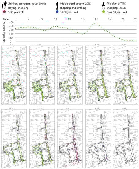 The number of people in the outdoor space is significantly higher after 5:00 a.m. because many people get up early for grocery shopping in the farmers’ market. The number of people in the outdoor space reaches the highest around 5 p.m. due to many people gathering around the snack street and the farmers’ market after work. After 7 p.m., the number of people in the outdoor space starts to decrease because the vegetable markets and stores close one after another, and the existing outdoor space cannot provide a place for leisure activities. After 10 p.m., the outdoor space is almost empty because all stores are closed, and there are no places for leisure activities outdoors (Figure 5).