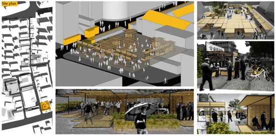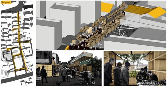 In the history of human settlement, streets and squares have been the center of cities and meeting places [37]. So, in the Rongxiang block of Wuxi, we use streets and the entrance square to create a “Living Field” for daily activities. In the design of the streets in the Rongxiang block, first, the transition from fast to slow traffic is achieved by parking cars on the periphery of the residential areas and creating a pedestrian zone [37]. Second, the storefronts and store signs along the street are repositioned through modular devices to create a unified street interface. Third, we use modular installations to create many edge spaces with privacy in the more public streets, providing places for people to rest, stay, and observe. Lastly, the design of the street interface is enriched by using elements with community cultural symbols based on modular installations (Figure 10). In the design of the entrance square, modular devices are used to build a multi-functional space that can provide a variety of functions, such as dancing, sightseeing, resting, and communicating. The modular devices can be reorganized to accommodate new spatial activities, such as walking, sunbathing, playing, stopping, resting, shopping, eating, talking, and greeting, according to different weather, time, and usage needs. The interior of each modular device is a private space, and the small square surrounded by them has become a public area for people’s collective activities. In the street part of the square, modular devices are used to design the landmark and sell space to enhance the identifiability and regional characteristics of the entrance (Figure 11).