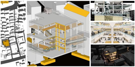 In the design of the Rongxiang block, first, the layout of the “h”-shaped block around the Rongxiang Farmers’ Market is preserved, the characteristics of narrow streets are maintained, and the spatial nodes are created in the way of regional expansion at the intersection of the road. Second, the Farmers’ Market building is used to create a space with rich functions and for residents to stay, reconstructing it from space with only sales function to a container that can carry public life. In the design of the building, the overall transportation system of the building is redesigned. Through the erection of the outer ramp, the elderly and people with disabilities can easily enter and leave the market. The first floor is designed as a space for both selling and leisure activities. Through the removal of the enclosed wall, residents can enter and leave the mall conveniently, thus enhancing the openness of the building. The second and third floors are designed as selling spaces. Through the setting of the atrium, people can interact with each other while shopping. The fourth to sixth floors are designed as outdoor multi-functional spaces. Through the change of the space, people can have a variety of activities here. Since the peripheral ramp is an independent transportation system, even if the market from the first to the third floor is closed at night, the outdoor activity space above the fourth floor can be reached directly through the ramp. So, this outdoor activity space can be used as a venue for nighttime activities for young people and children (Figure 12). By creating the activity space that residents can occupy, community residents will spontaneously develop a sense of pride and belonging to the community space.