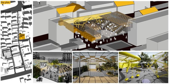 The Wuxi Rongxiang block is a square area composed of several communities, and the main outdoor space is the external street. Therefore, in the macro planning, we chose to separate the residents’ daily life and public life and use the street, the main path of the block, as the main carrier of public life, restoring the privacy of the community’s internal space. Through fieldwork, we found that residents gather on the street mainly in the southern entrance area, the middle intersection area, and around the farmers’ market (Figure 8). Therefore, these areas were planned as the nodes in the place. We extended the southern and central entrance locations into plazas and designed the farmers’ market as a place for both shopping and leisure activities. In the southern entrance plaza, we designed the landmark of the place using modular installations (Figure 9). In addition, we considered the relationship between privacy and publicness in the design of each node. The “edge effect” theory proposed by Western psychologist Derk de Jonge mentions that people instinctively move around the edge of a site, and the edge is a semi-open space where people can observe and hide simultaneously. Therefore, we created many edge spaces in the design of the node, so that the outdoor activity space can meet both privacy and publicness needs.