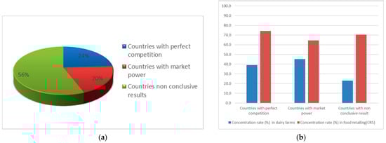 Main results of the market power test. (a) Results of market power test on EU-25 dairy chains (%). (b) Results of market power test on EU-25 dairy chains (%). Source: own elaboration.