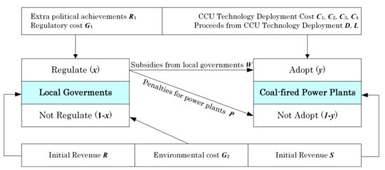 Based on the above context, in this paper we construct an evolutionary game model of the interaction between the stakeholders of CCU technology—that is, local governments and coal-fired power plants—as shown in Figure 1. Through an analysis of the evolutionary game model, we attempt to reveal the influences of different factors on the behavioral strategies of stakeholders, as well as the conditions under which power plants will choose to adopt CCU technology. The remainder of this paper is structured as follows: Section 2 provides a review of the recent advances in CCU technology and evolutionary game theory in the literature. Section 3 details the construction of an evolutionary game model for the stakeholders of CCU technology and stability analyses for various cases. In Section 4, the simulation of the behavioral strategies of stakeholders is discussed and a sensitivity analysis of the key variables is provided. Section 5 concludes the paper and presents policy recommendations based on the results of the analysis.