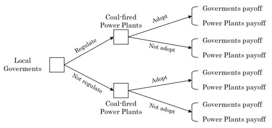 In the case that local governments choose not to regulate, and coal-fired power plants choose not to adopt, the power plant will receive the original benefit while the local governments must pay the environmental cost due to environmental degradation. The local government’s total payoff is defined as , while the coal-fired power plant’s total payoff is defined as .