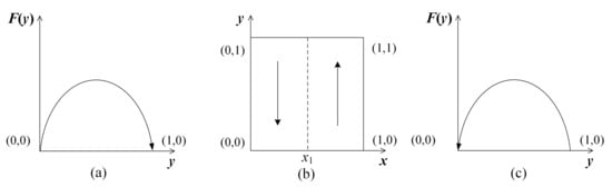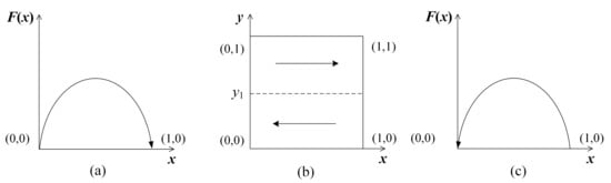 Case f: . In this case, , which means is established. Based on this premise, it is easy to deduce that is the only ESS for power plants. This situation means that the ESS of the power plants switches to “not adopt”, due to the high cost of deploying CCU technology. The dynamic evolutionary path of the power plant’s strategy is shown in Figure 4c.