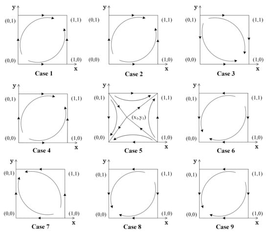 Nine cases were derived by combining Case a, Case b, Case c with Case d, Case e, Case f, where Case 1: , ; Case 2: , ; Case 3: , ; Case 4: , ; Case 5: , ; Case 6: , ; Case 7: , ; Case 8: , ; and Case 9: , . We determined the stability of the five equilibrium points under various scenarios by using the Jacobian matrix. The calculation results are summarized in Table 3.