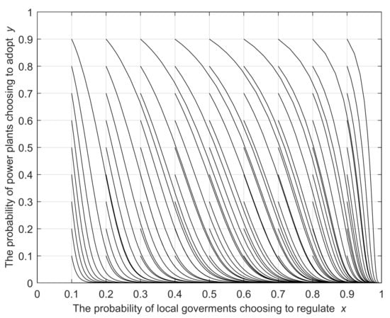 Case b: . In this case, if , we can obtain that is the ESS for the local government; if , is the ESS for the local government. The results of the analysis suggest that the strategy of choosing regulation in the situation of elevated regulatory costs is no longer the only ESS for local governments; the local government’s ESS will also change as the strategy chosen by the power plant changes. The dynamic evolutionary path of the local government’s strategy is shown in Figure 3b.