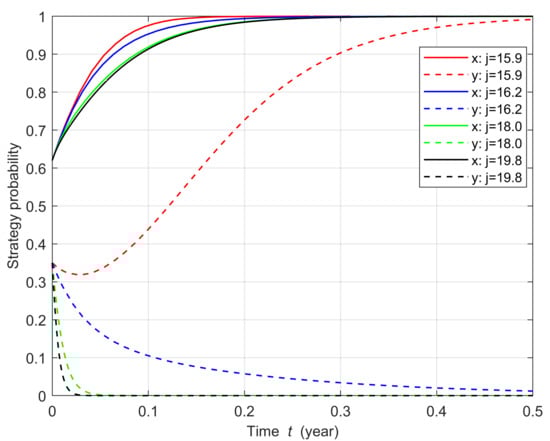 The sensitivity of the system evolution path to changes in unit hydrogen cost is shown in Figure 7. When the price per unit of hydrogen increases by 10% (from 18.0 RMB/kg to 19.8 RMB/kg), the probability that a power plant will adopt CCU technology evolves faster, from 0.35 to 0. As the unit price of hydrogen gradually decreases, the evolution of the strategy of the thermal power plant slows down; when the unit price decreases by 12% (from 18.0 RMB/kg to 15.9 RMB/kg), the strategy of the plant changes and the probability of taking the “Adopt” strategy gradually converges to 1 over time. The willingness of a power plant to deploy CCU technology gradually increases as the total cost of hydrogen decreases, suggesting that government measures to promote lower hydrogen prices will have a significant positive effect on the proliferation of CCU technology. According to a report by the Hydrogen Energy Council [37], the cost of hydrogen will drop dramatically over the next decade, and is expected to drop by as much as 50% by 2030. The cost of hydrogen production from coal has been reported to be 7.24–19.4 RMB per kg under different conditions [38]. Although the cost of hydrogen production from renewable energy by electrolytic water is still at a high level, it is expected to be reduced to a competitive level in the future, compared with traditional methods of hydrogen production, as technology advances [7,39]. Research on hydrogen preparation is in full swing; as such, government departments should consider the synergistic development of hydrogen production technology and CO capture and utilization technology as an important means to promote the application of CCU technology.