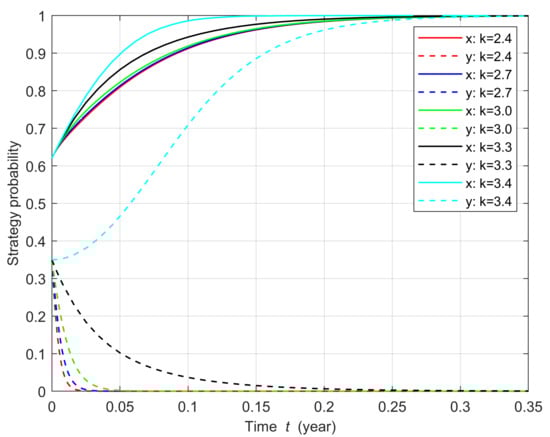 The sensitivity of the system evolution path to changes in unit price of carbon-dioxide-derived chemicals is shown in Figure 8. As the price of carbon dioxide-derived chemicals increases, the rate at which y converges to 0 gradually slows down and the rate at which x converges to 1 accelerates. The ESS of the replicator dynamic system shifts from to when the unit price of the product is increased by 14% (from 3 RMB/kg to 3.4 RMB/kg). The production of higher value-added CO-derivatives can enhance the benefits of deploying CCU technology and increase the proactivity of power plants to take the “Adopt” strategy.
