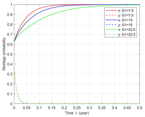 The sensitivity of the system evolution path to changes in regulatory cost is shown in Figure 9. The regulatory cost was set to 7.5, 15, or 22.5. We can observe that the rate of evolution of the thermal plant strategy does not change significantly as the regulatory cost increases, but the rate of evolution of the local government strategy decreases significantly. Therefore, it is necessary to improve the administrative efficiency of the government and reduce the cost of regulation appropriately.