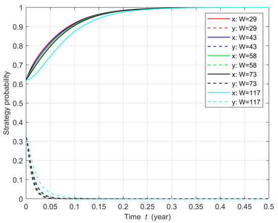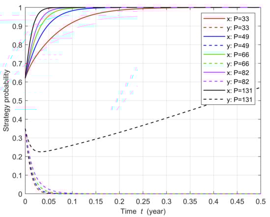 The sensitivity of the system evolution path to changes in punishments on power plants is shown in Figure 10. As the penalty amount gradually increases, compared with the baseline scenario, the rate of evolution of the local government’s strategy increases while the evolution of the power plant’s strategy slows down slightly. Only when the penalty increases to four times the baseline scenario does the ESS of the system slowly switch from to , and the power plants choose to deploy CCU technology under the government regulations. Penalties for power plants that refuse to deploy CCU technology can have a catalytic effect in promoting the diffusion of CCU technology; however, it is not wise to use penalties as a single policy tool.