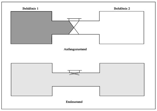 To get an impression about how the concept of “entropy” is understood and used in economics, we start with a thought experiment. Consider a simple thermodynamic system isolated from the environment, consisting of two gas containers. In the initial state, both containers are separated from each other by an impermeable membrane, the first one (Behältnis 1) is filled with an ideal gas and the second one (Behältnis 29 is evacuated. If the separating wall is penetrated, gas flows from the filled container into the empty container until the gas is distributed equally between the two containers in the final state (Endzustand) (see Figure 1).