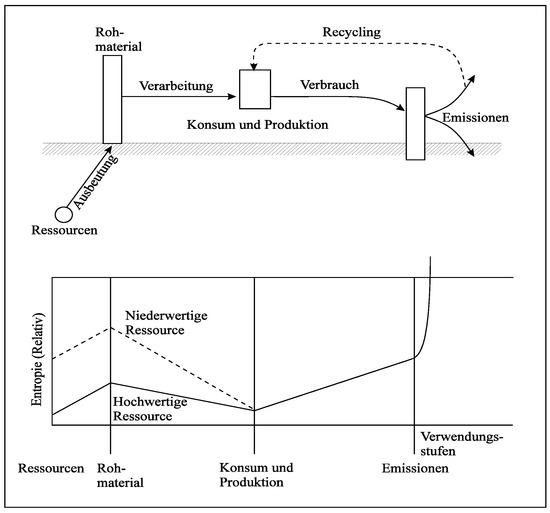 The entropy flow triggered by economic activities can be determined. Economic activity means in particular to use and mix resources and energy in order to produce the desired economic goods. Let us accompany a raw material such as copper for example on its way through the economic system and observe the entropy flows occurring in the process. As is shown in Appendix A, a change in copper concentration will lead to entropy flow according to dS = NRln(χ1/χ2) = NR(lnχ1 − lnχ2) (see the Appendix A). Therefore, we can distinguish at least three stages (see Figure 2): First, the raw material (Rohmaterial) is extracted from the environment and processed. This requires energy, which generates an entropy flow. Subsequently, substances are mixed during production and consumption. Thus, the raw material, originally available in great purity, is transformed into a less concentrated form, which again triggers a flow of entropy. Ultimately, the raw material is released into the environment as emissions and waste, thus further mixing, resulting in a further flow of entropy. This observation causes direct consequences for sustainability. Sustainable action must aim at minimizing the entropy flows that economic activity triggers.