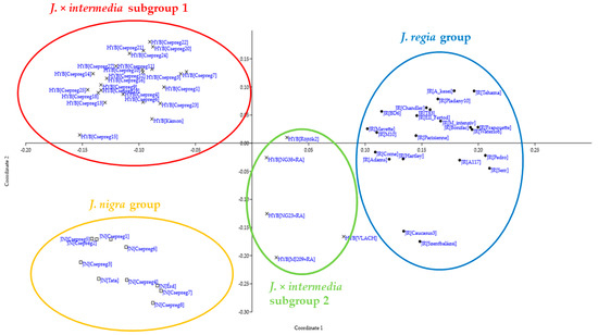 Result of the principal coordinate analysis (PoCA). The different groups of samples are signed with the following colors: blue—J. regia, yellow—J. nigra, red—J. × intermedia subgroup 1 (from the study plot), green—other hybrids, subgroup 2.
