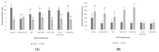The highest photosynthetic rate in February was recorded in the UREA treatment; this value (approximately 11 μmol CO2 m−2 s−1) was significantly higher to those determined in the UREA + DCD and BD treatments for the same period (Figure 6A). In June, significant differences were found only between the UREA and UREA + DCD treatments. Generally, significantly higher photosynthetic rates were recorded in February, than in June (Figure 6A). In contrast, stomatal conductance, in most treatments, was significantly lower in February, than in June (Figure 6B). Intercellular CO2 concentration in February was significantly higher in UREA compared to most of the other treatments; in contrast, for the same treatment in June, the lowest intercellular CO2 concentration was recorded compared to all the other treatments (Figure 6C).
