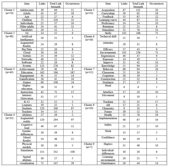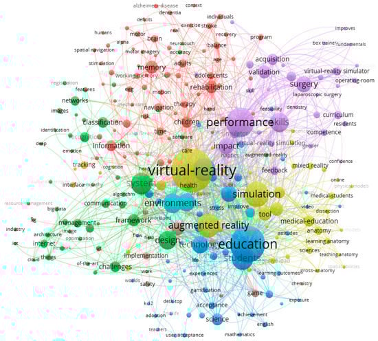 The keywords “virtual reality”, “VR”, and “education” were used to map the research field and to identify prominent thematic areas (see Figure 1). The retrieved word items were manually screened to remove unnecessary terms that seemed irrelevant and to exclude words that appeared less than five times to spatially reveal the structure of the research field. Research from the database, the VOSviewer generated nine clusters with 267 word items and 4469 links, 7539 total link strength. Of the 267 word items, the following words have the high values of the total link strength: “virtual reality” (total link strength 798), “education” (total link strength 596), “performance” (total link strength 526), “students” (total link strength 346), “simulation” (total link strength 332), “augmented reality” (total link strength 294), “system” (total link strength 276), “skills” (total link strength 268), “technology” (total link strength 258), “environments” (total link strength 238), and “experience” (total link strength 227). The network co-occurrence analysis results suggest that the higher links and total link strengths generally correlate with higher occurrences.