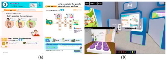 As shown in Figure 3 below, in an English digital textbook, students acquire linguistic information (e.g., This is my mother, This is my teacher, This is my father, etc.) through multimodal learning by clicking on a certain icon on the screen, move on to the next page, and input answers on the crossword puzzle to check their understanding. On the other hand, in a metaverse, students in avatars walk in each to experience learning contents, and by clicking on a 3D object, penguin here, a VR learning content will pop-up that helps students roam around the 3D space to solve a quiz (more details will be presented in the results section.) More importantly, a high level of interaction based on togetherness and presence becomes possible because a teacher is in the same space with students while maintaining a meaningful conversation and interaction.