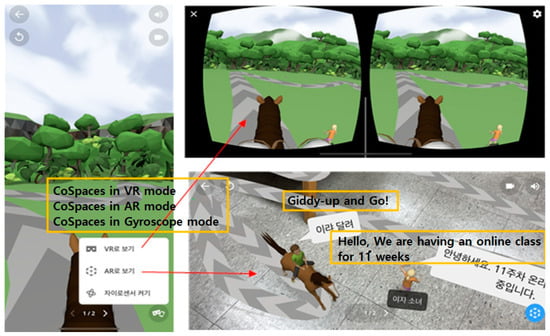 Based on an in-depth analysis of digital learning contents and after examination of what can be converted to VR contents, pre-service English teachers started to engage in VRM processes by the use of Cospaces Edu in classroom and as an assignment (see Figure 7). Then, with the help of professors, they connected them to a metaverse platform, Frame VR, to facilitate meta-modal learning opportunity and potential in 3D virtual synchronous learning environments.