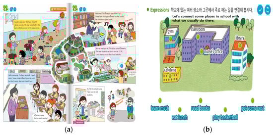 One of the chapters in a middle school textbook has a reading passage that describes the characteristics of five buildings (Gym, Classroom, Nurse’s office, Cafeteria, Library) on a school campus. Inside each building, a teacher, librarian, nurse, and school dietitian greet and explain to students what they do with time information (Figure 8a). Then, on the following page, students check their understanding upon a reading passage, trying to match a main activity in a building with its name (Figure 8b).